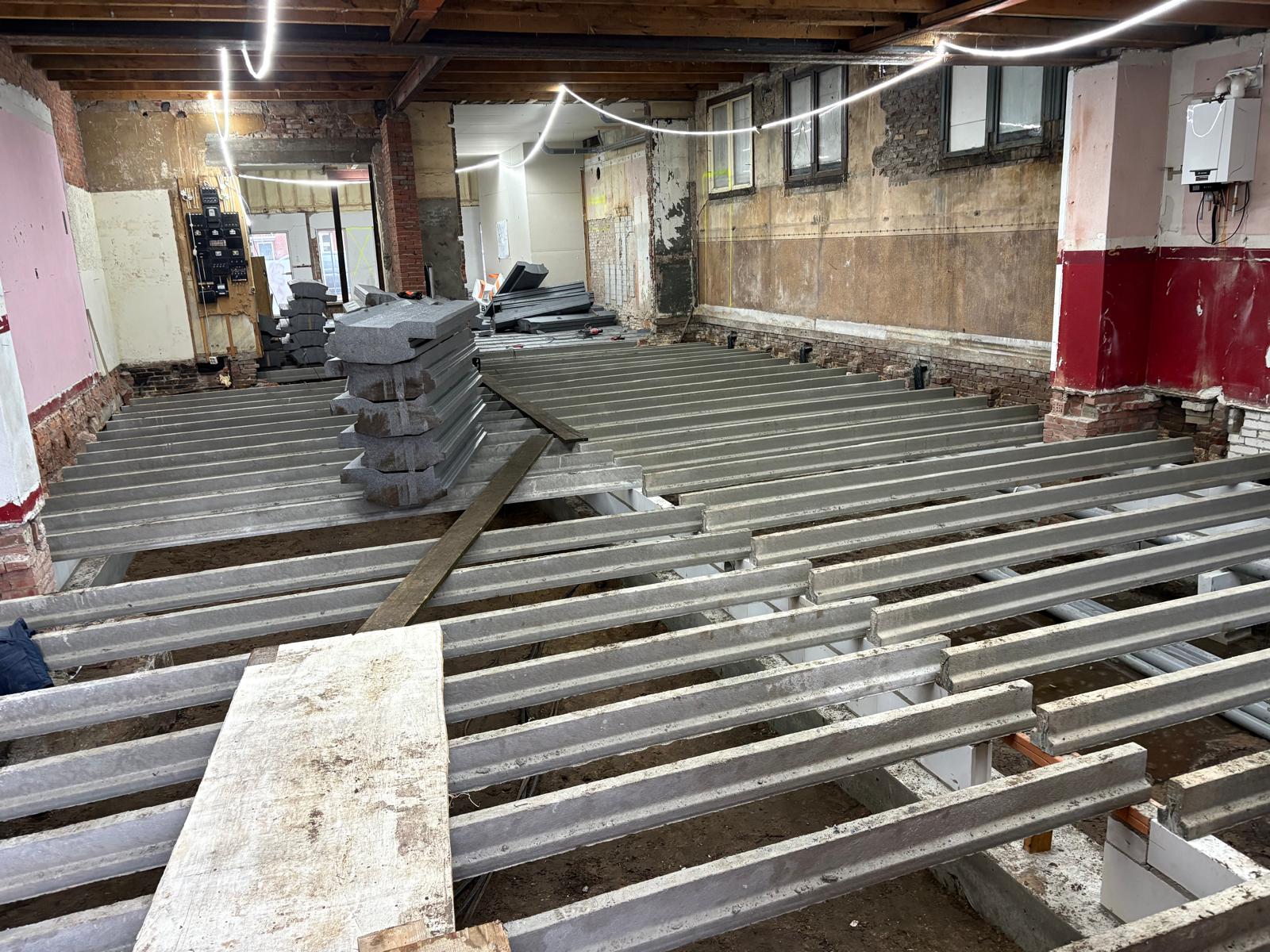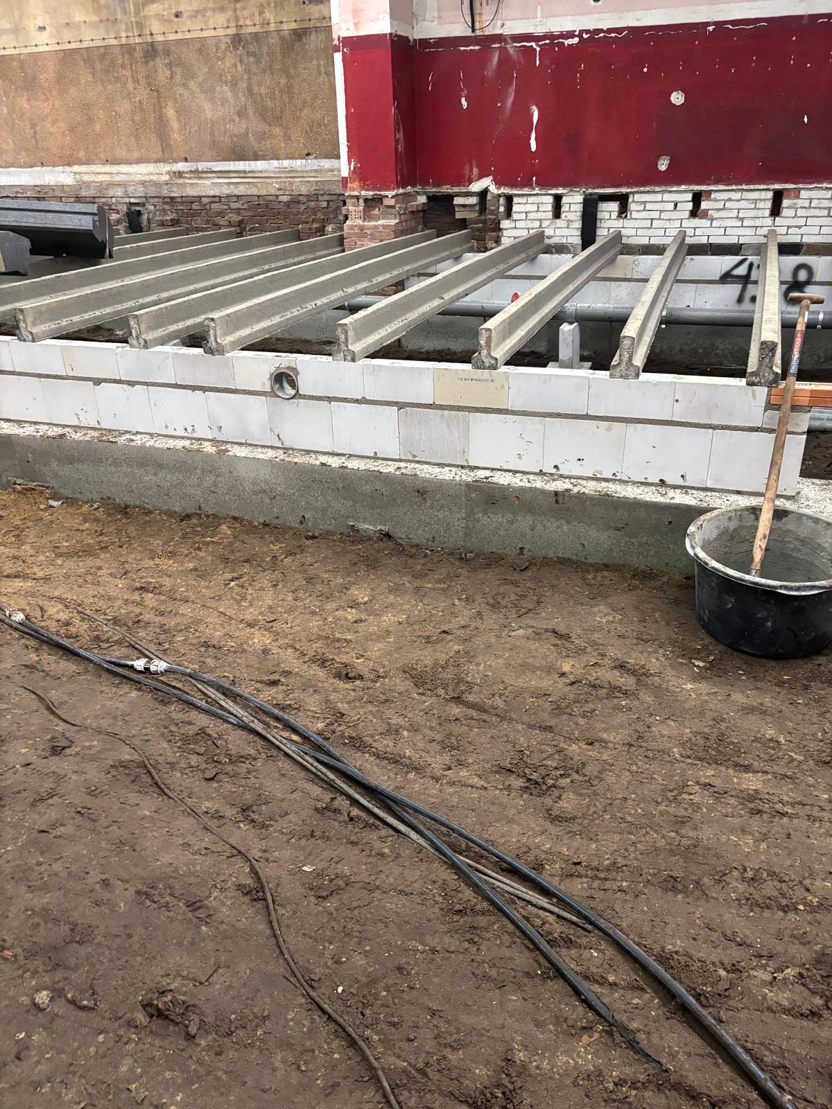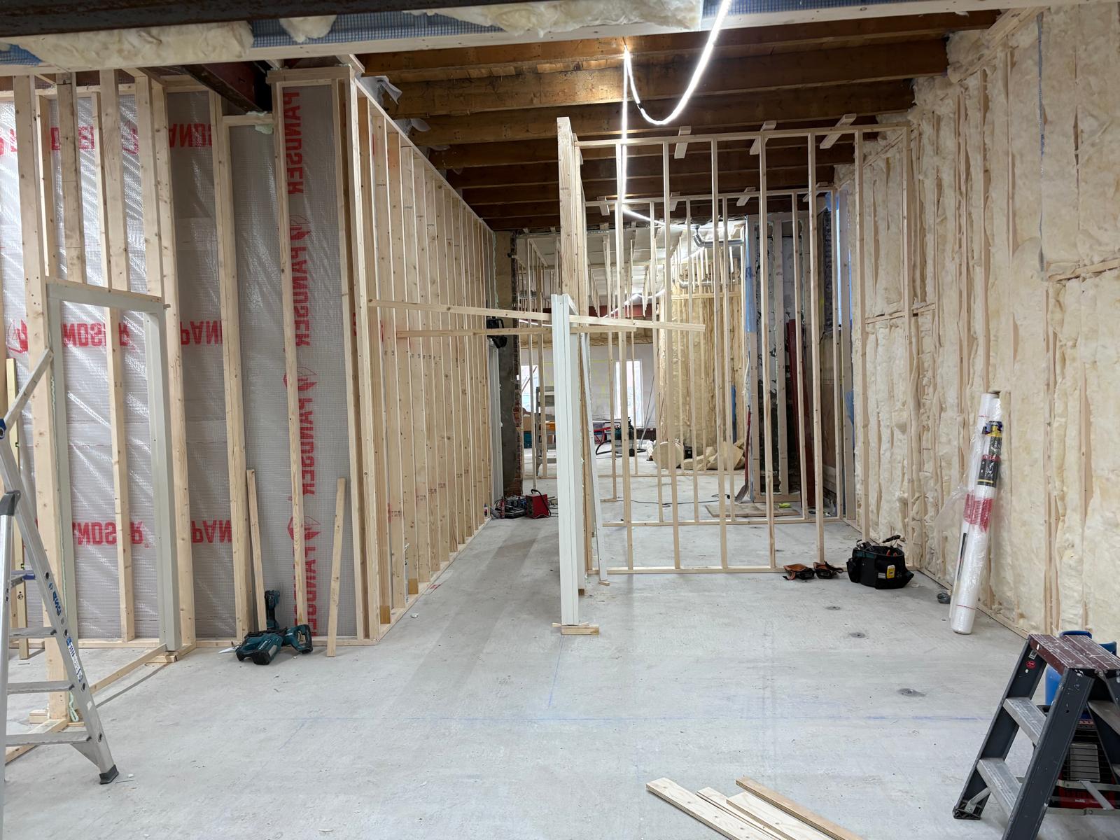 De werkzaamheden zijn gestart met het aanbrengen van een nieuwe fundatie met opgaand metselwerk en een PS-isolatievloer. Daarnaast zijn de buitengevels voorzien van nieuwe voorzetwanden. Momenteel wordt gewerkt aan de montage van de houtskeletbouw binnenwanden en het uitlijnen van de plafonds ter voorbereiding op de nieuwe gipsplafonds.